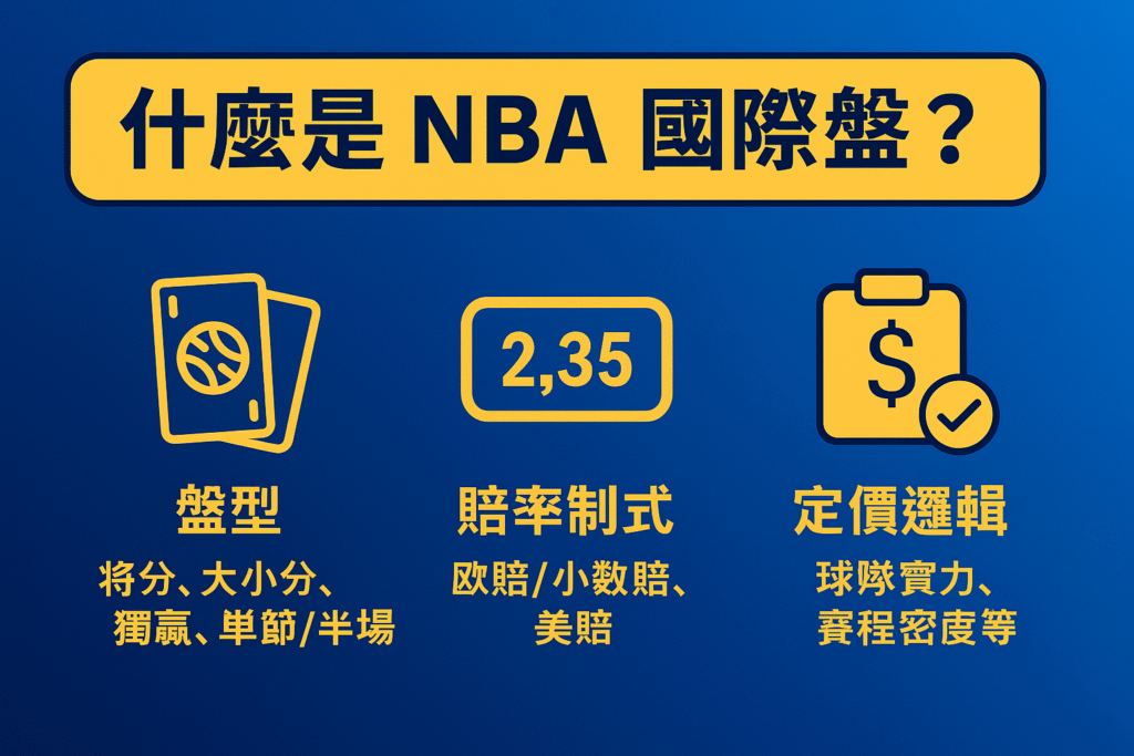 NBA 國際盤多以歐賠/小數賠呈現,主打 讓分、大小分、獨贏、單節/半場盤 等多元選項,盤口更新較快、流動性高,能更即時反映 傷病、主客場、背靠背 等因素。